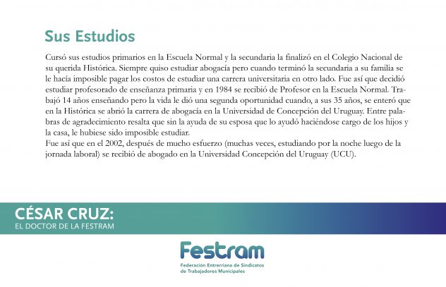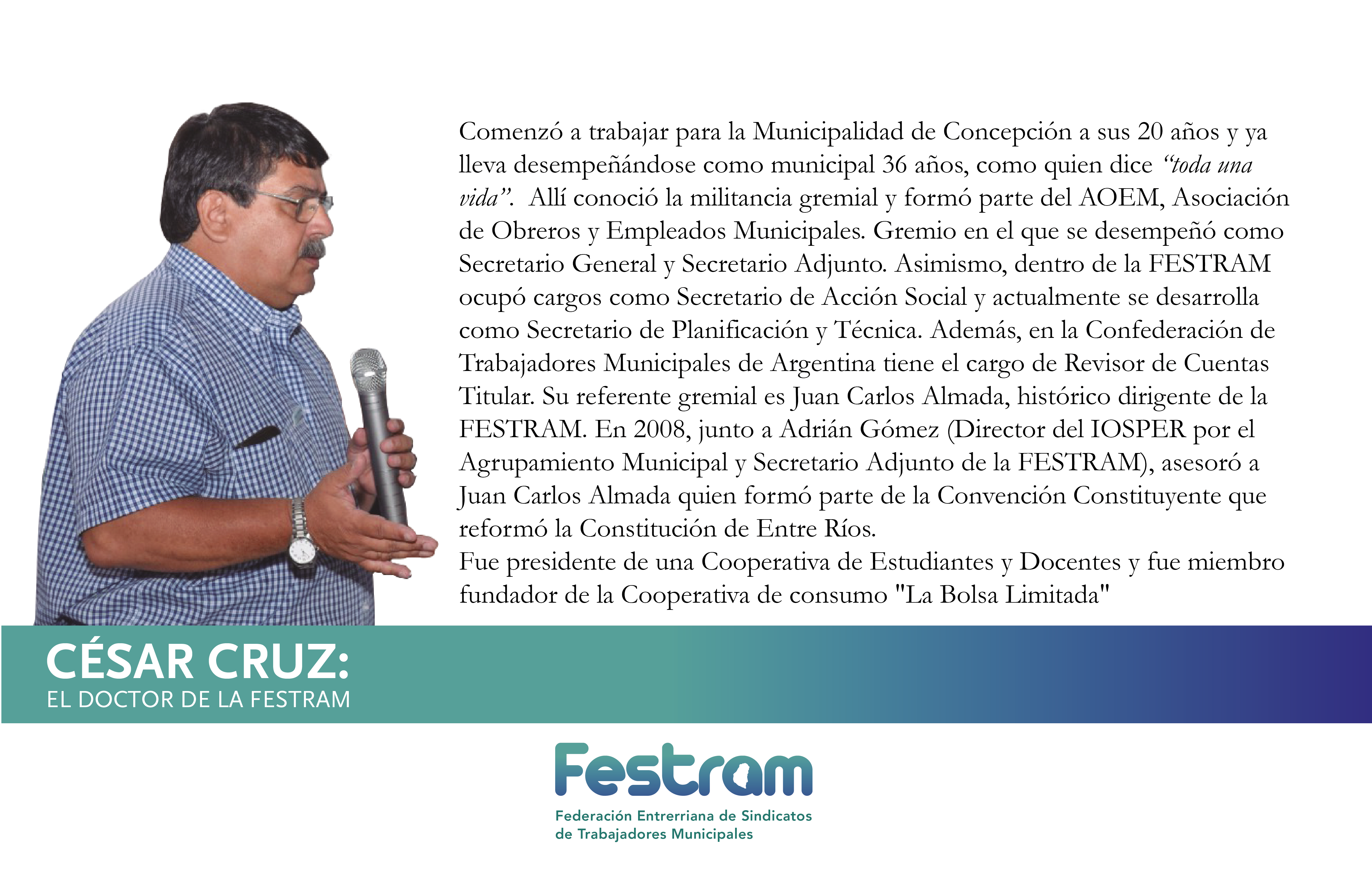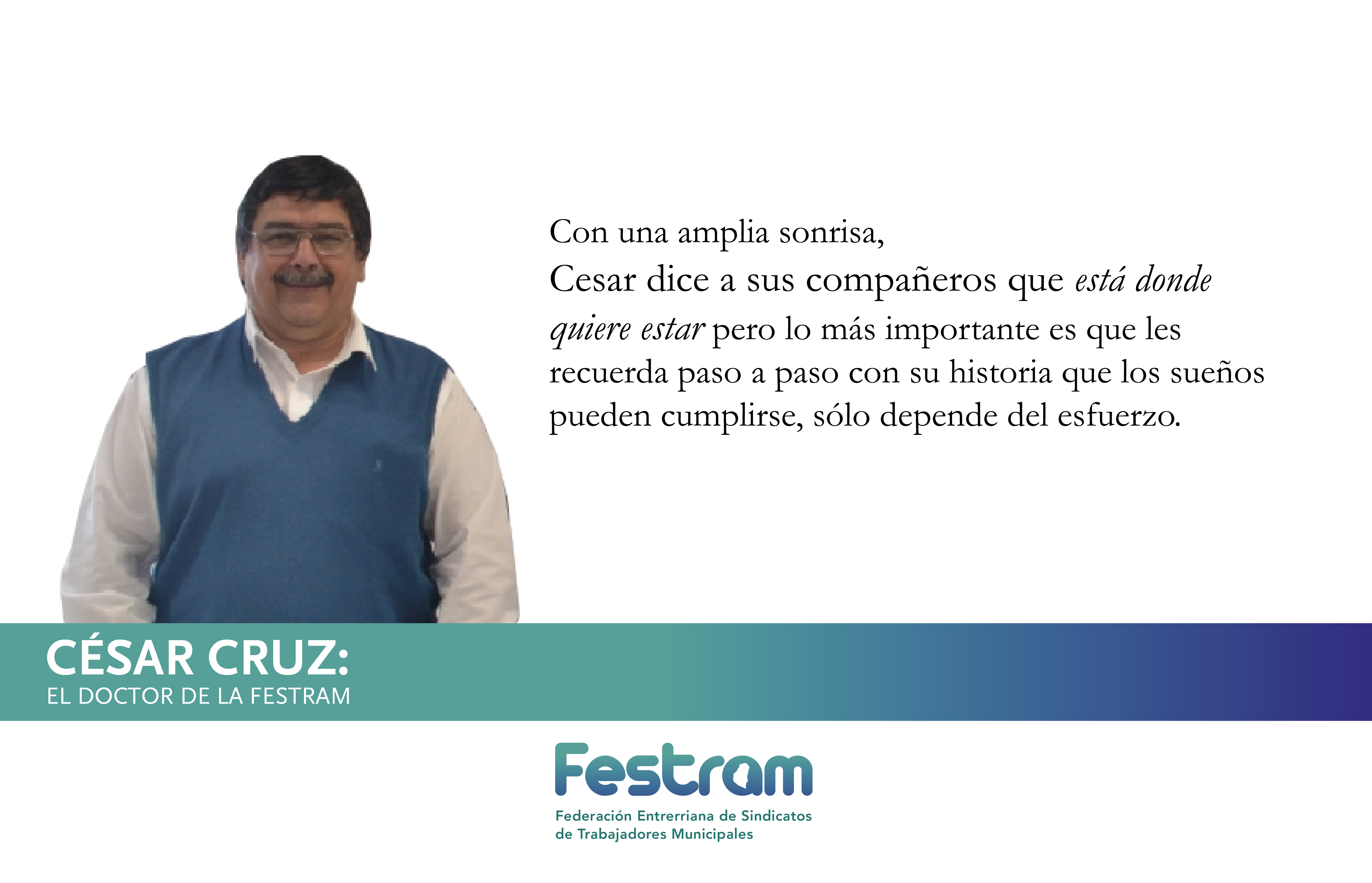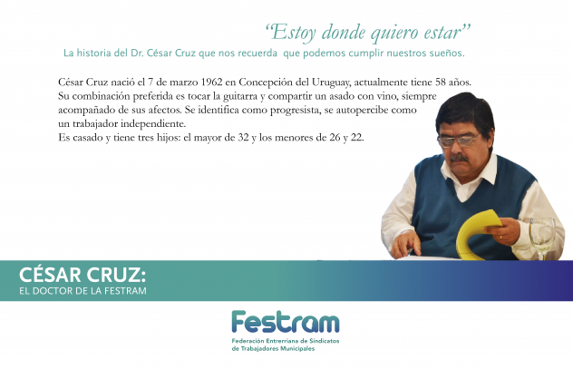 Biografías de la FESTRAM: Conociendo la historia de vida de nuestros Dirigentes. Capítulo 1: César Cruz 21 agosto, 201921 agosto, 2019 FestramNoticias Hoy conocemos al Doctor de la FESTRAM Además de abogado, Cesar es también profesor Desde hace 20 años que es empleado municipal y ha ocupado diversos cargos a lo largo de su vida La historia de vida de Cesar nos deja un mensaje esperanzador La historia de vida de Cesar nos deja un mensaje esperanzador