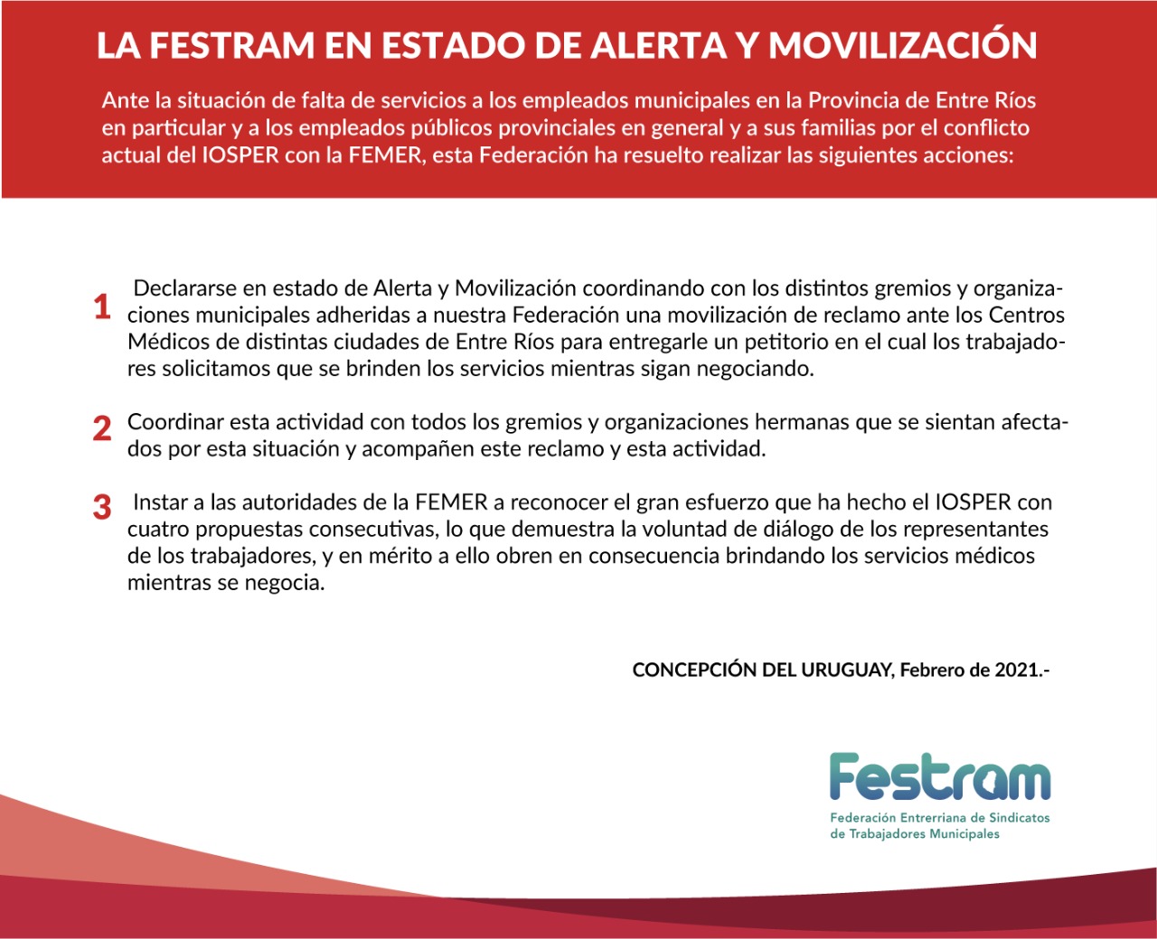 Ante la situación de falta de servicios a los empleados municipales en la Provincia de Entre Ríos en particular y a los empleados públicos provinciales en general y a sus familias por el conflicto actual del IOSPER con la FEMER, esta Federación ha resuelto realizar las siguientes acciones: